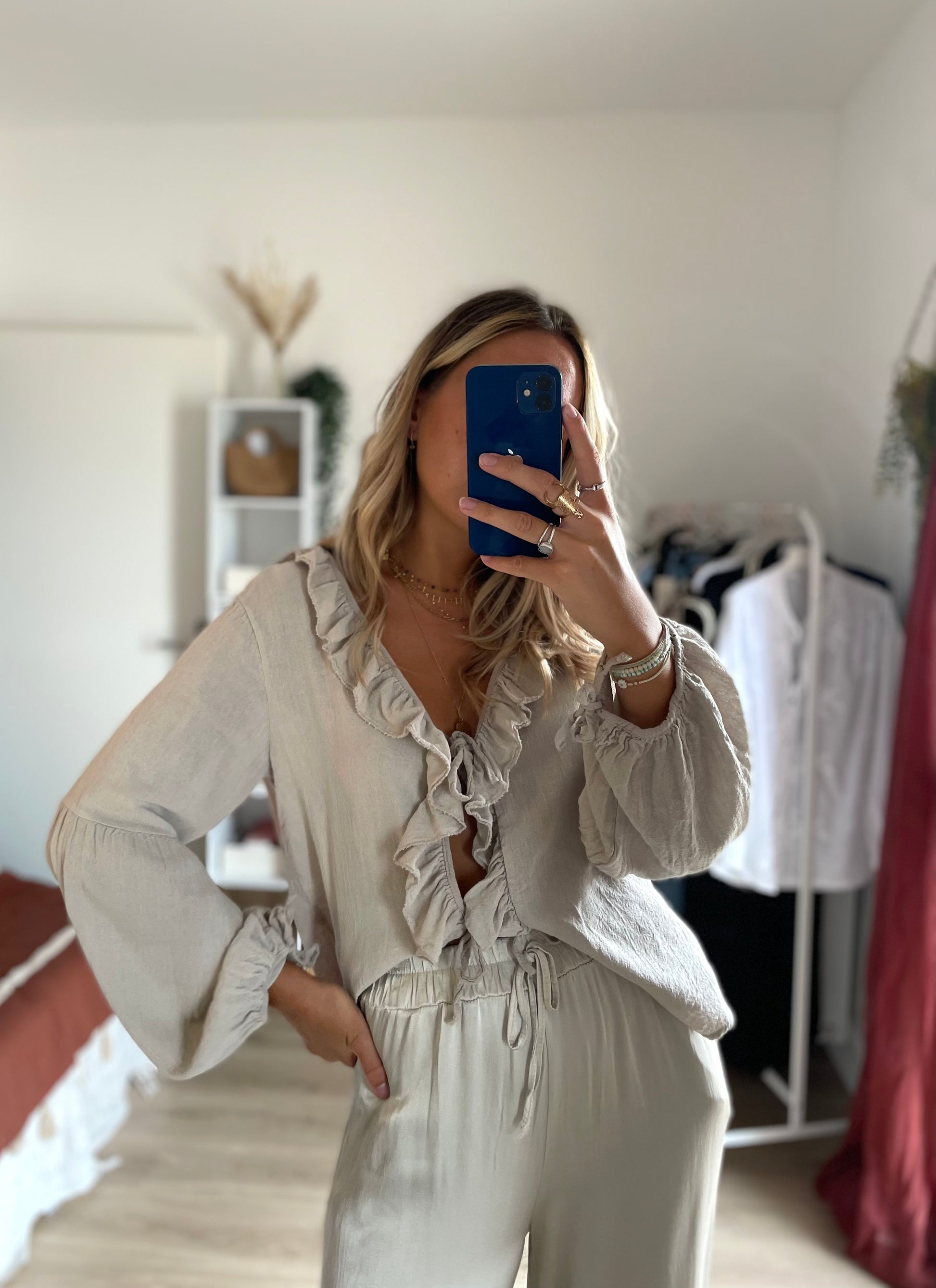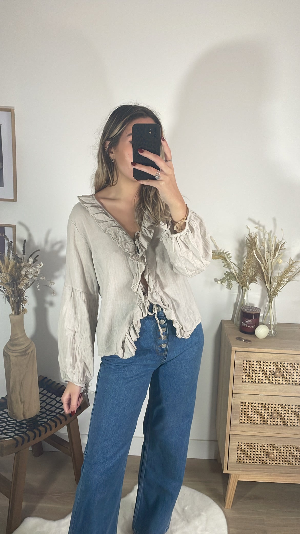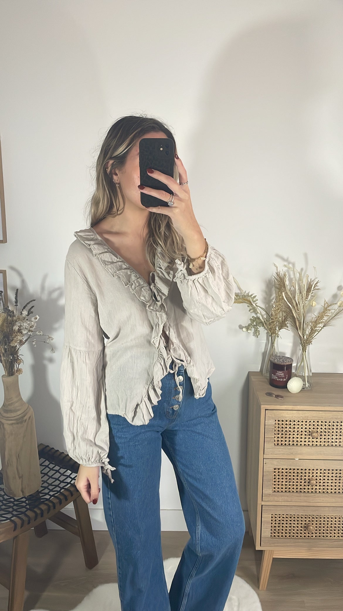 Style et Utilisation : Cette blouse polyvalente est idéale avec un jean pour un look décontracté ou avec une jupe pour une tenue plus habillée. Peu importe comment vous la portez, elle vous donnera toujours une allure chic et confortable. Les volants apportent ce petit quelque chose en plus qui fait toute la différence.