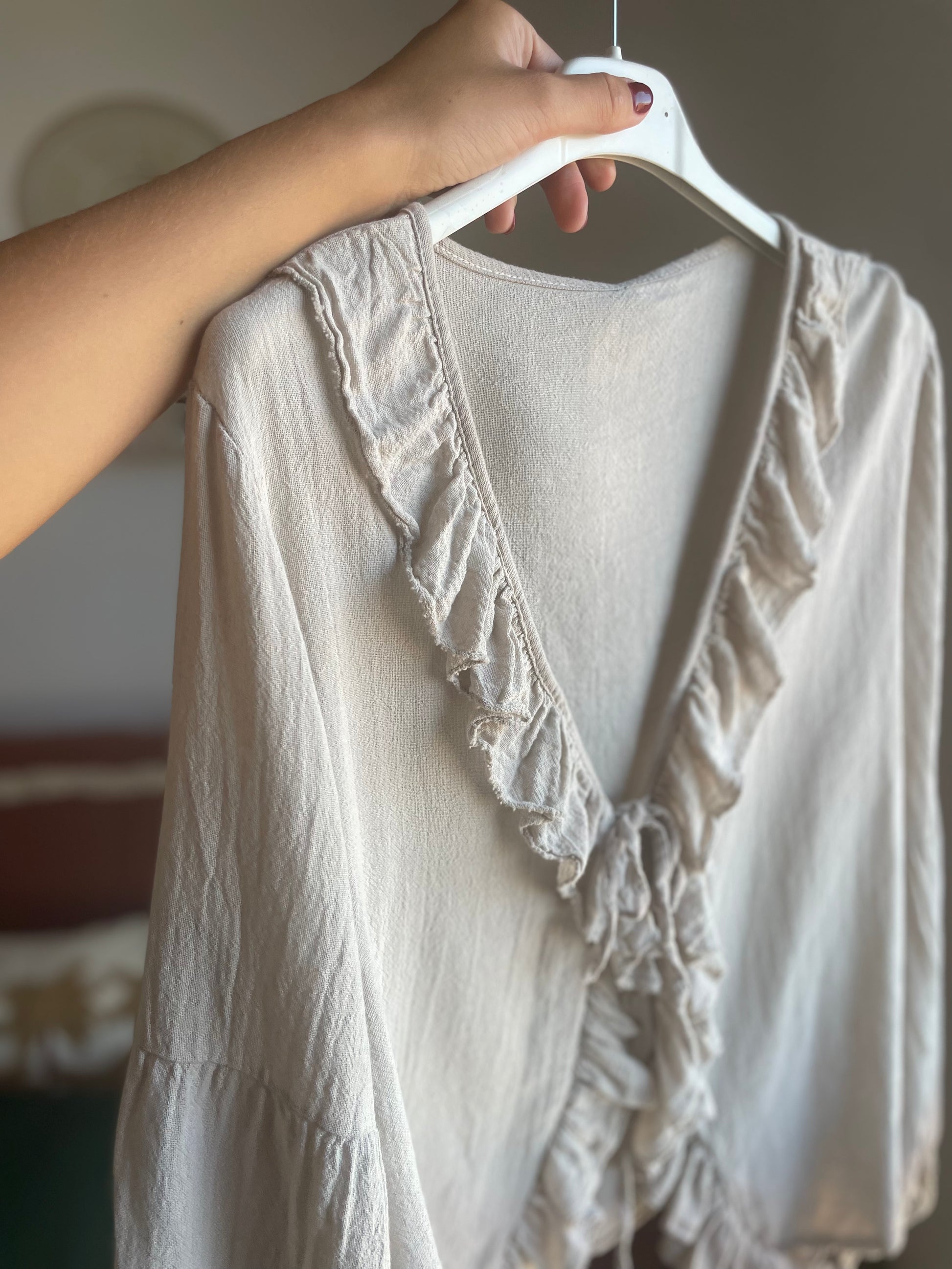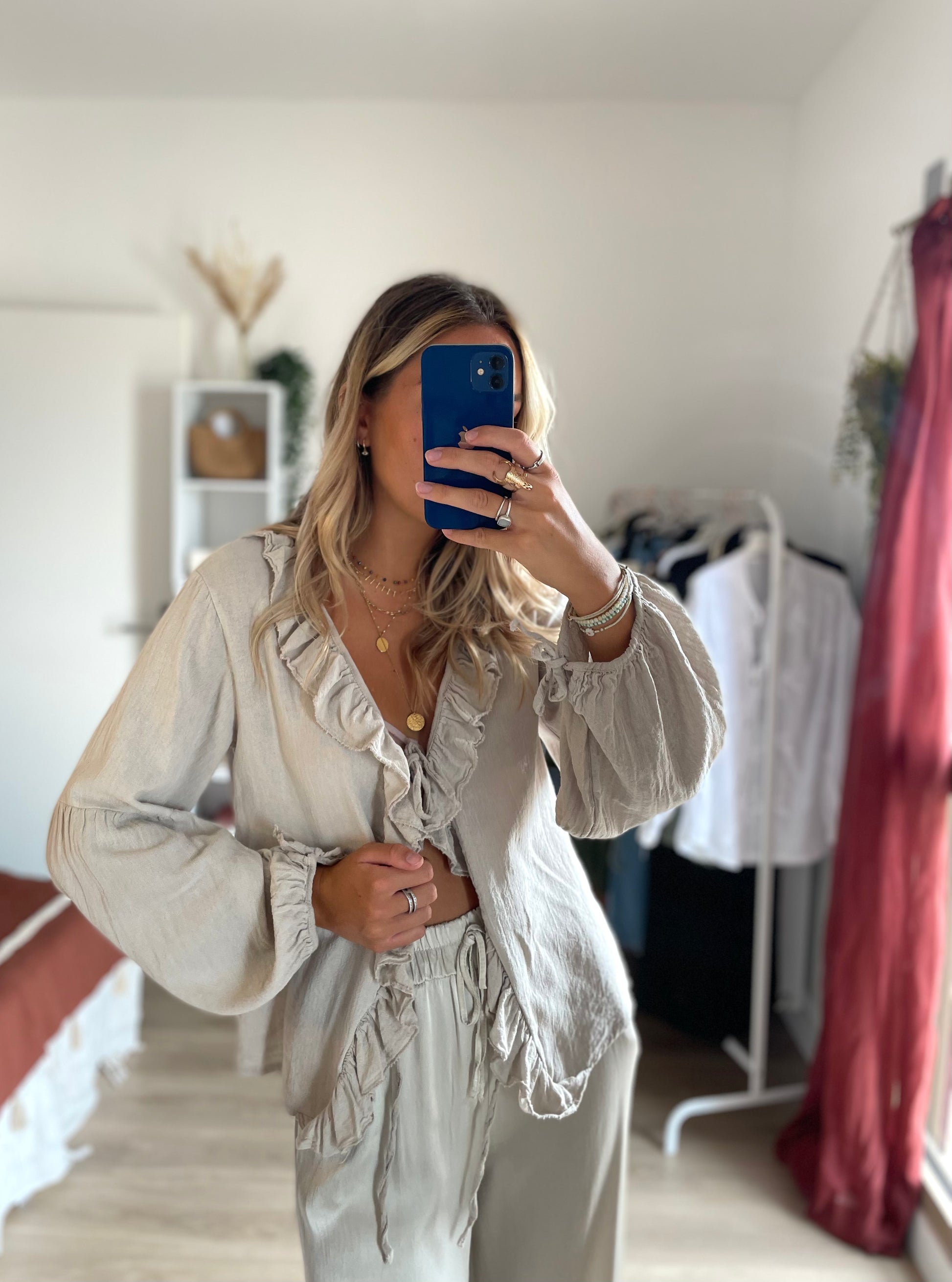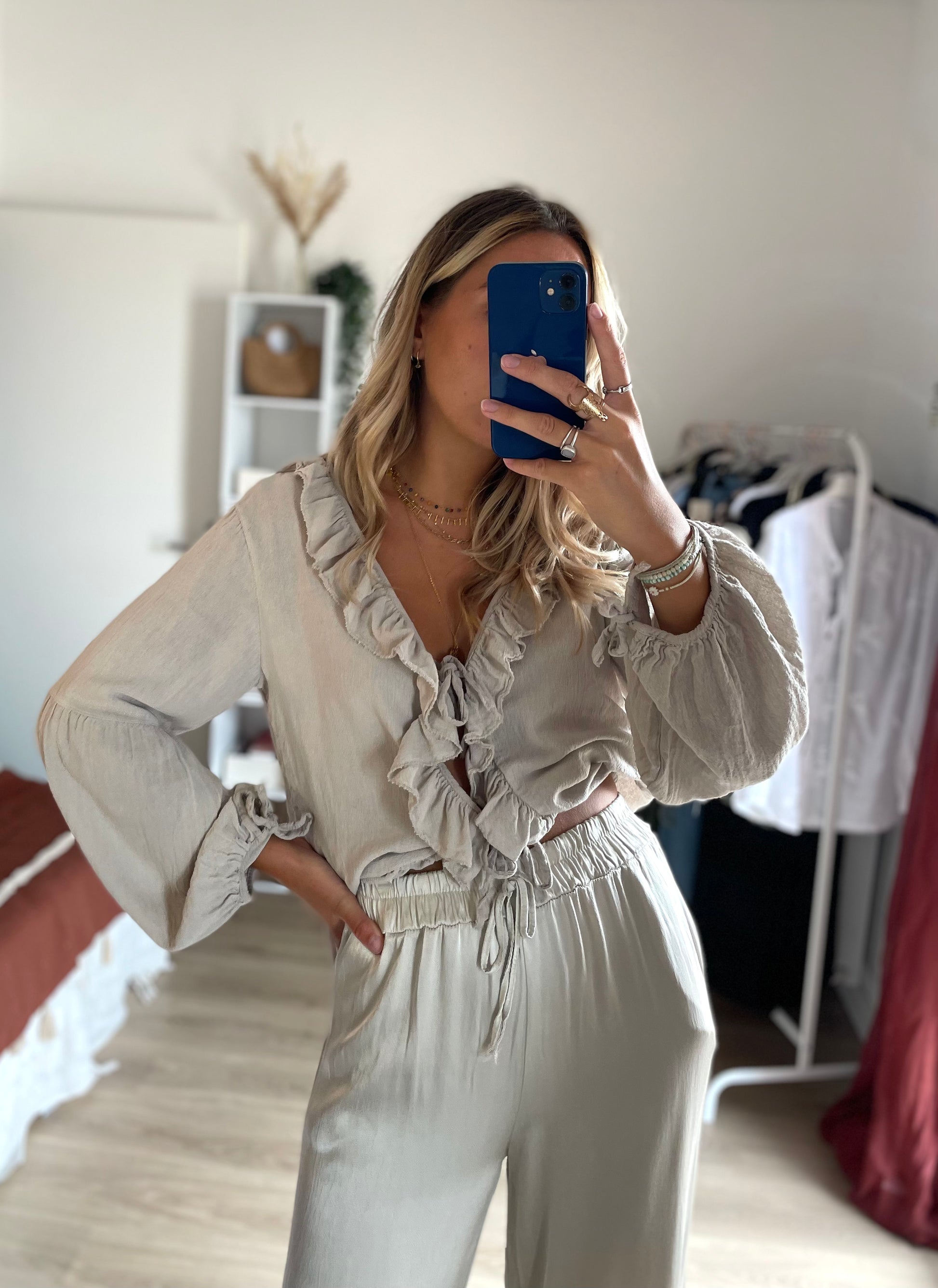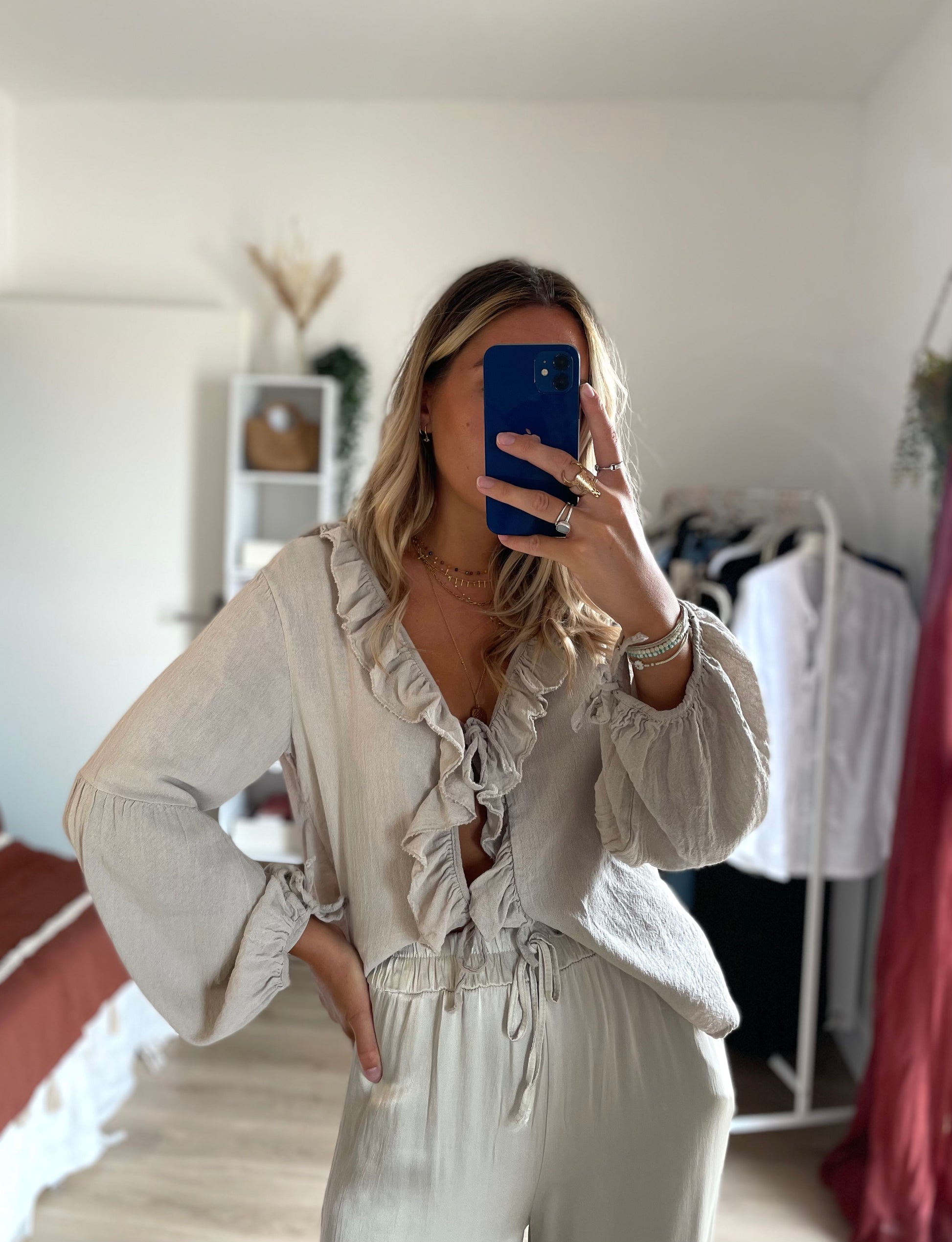 Style et Utilisation : Cette blouse polyvalente est idéale avec un jean pour un look décontracté ou avec une jupe pour une tenue plus habillée. Peu importe comment vous la portez, elle vous donnera toujours une allure chic et confortable. Les volants apportent ce petit quelque chose en plus qui fait toute la différence.