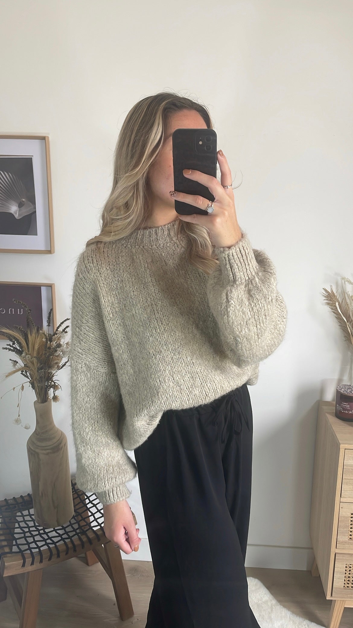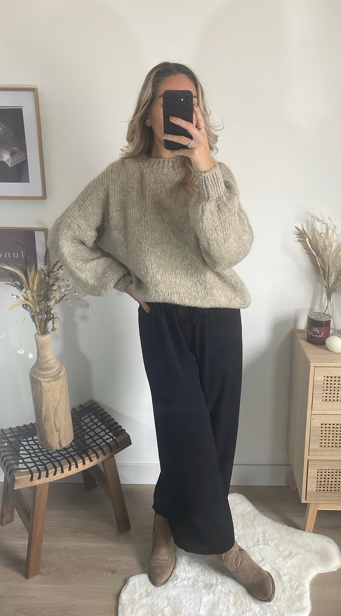 Pour un look stylé et facile à porter, associe ce pull taupe avec le pantalon Amelia ! Le pantalon Amelia, avec sa coupe fluide et légèrement évasée, s'accorde parfaitement avec la douceur et la couleur neutre du pull. Ensemble, ils créent une silhouette chic et moderne, tout en restant confortables.